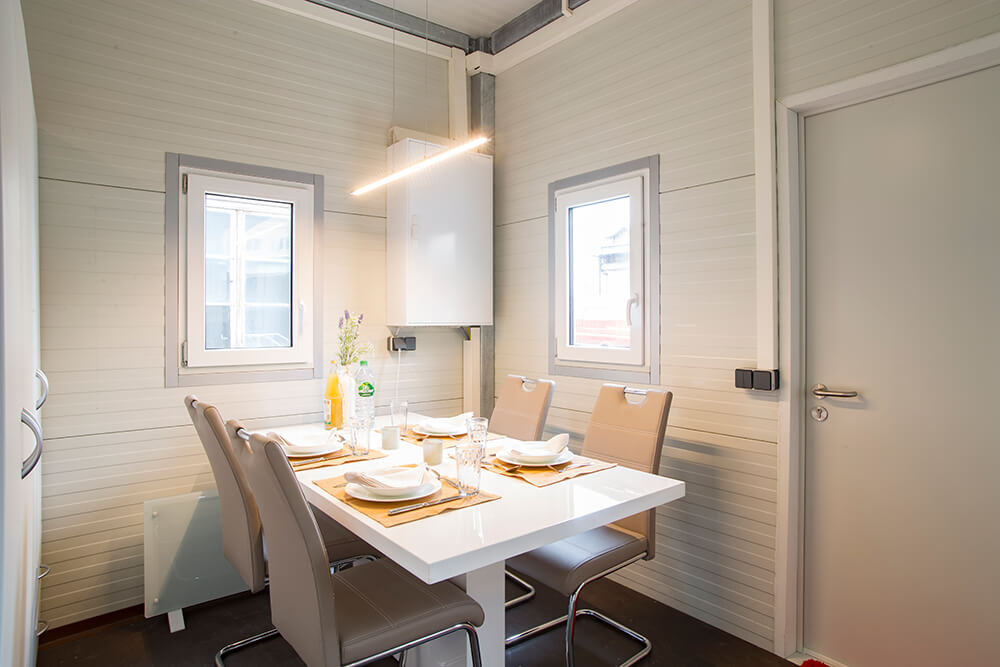 Der Wohnbereich im Wohncontainer bietet bis zu vier Leuten ausreichend Platz zum Essen und als Wohnzimmer bzw. Aufenthaltsraum, der durch 2 Fenster über Eck mit hinreichend Tageslicht versorgt wird.